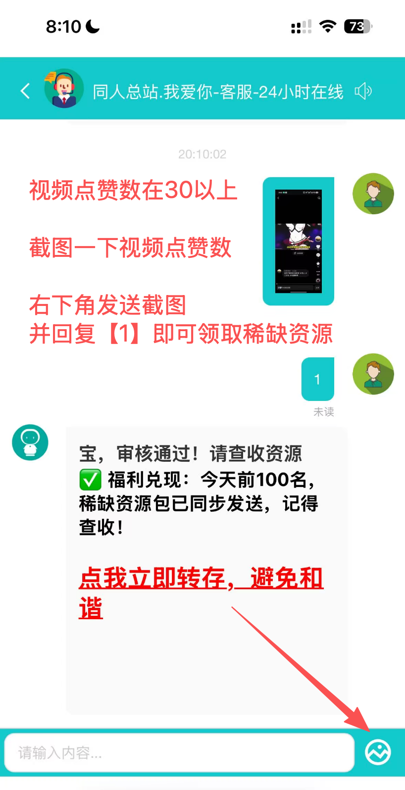 想领取【精选资源】的,等待视频点赞量在30以上的,截图视频点赞数,给客服发送截图,并回复【1】即可领取!